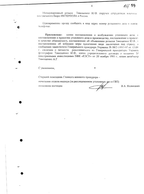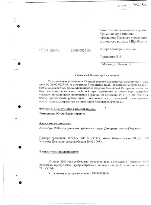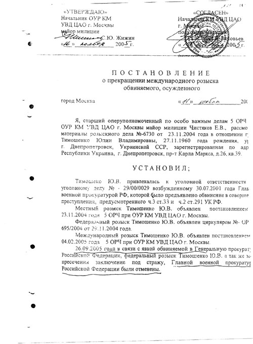 По странному стечению обстоятельств экс-премьера Тимошенко, которая была объявлена в международный розыск российскими правоохранителями, перестали разыскивать в 2005 году. Не исключено, что она нашла общий язык с руководством России и оно взяло своих служителей Фемиды на короткий поводок.