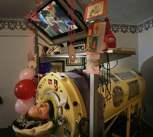 Диана Оделл из штата Теннесси прожила в таком металлическом ящике почти всю свою жизнь — в трехлетнем возрасте девочка заболела полиомиелитом и, чтобы спасти ей жизнь и обеспечить дыхание, Диану поместили в т.н. "железные легкие" — металлический резервуар длиной около двух метров и весом в 340 кг. Над головой Дианы повесили зеркало, для того, чтобы она могла наблюдать за происходящим вокруг нее, передает drugoi.livejournal.