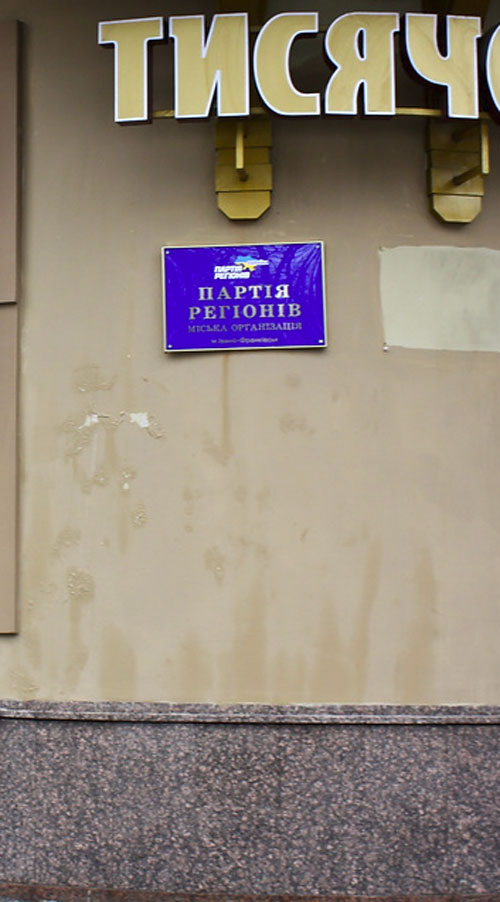 Сегодня утром стены помещения Ивано-Франковской городской организации Партии регионов (ул. Леси Украинки) были обильно испачканы кровью и мозгами. Сейчас их уже отмыли. Впрочем, окровавленный полиэтиленовый пакет и до сих пор в помойке возле автостоянки сзади медуниверситета. Чьи кровь и мозги - неизвестно. Надеемся, что не человеческие ...