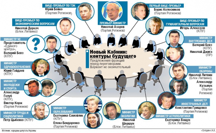 В прессе один за другоим появляются списки будущего правительства. Своим видением персонального состава Кабинета Министров «пацанов» из Партии регионов, идеология коих близка к черносотенному «за Веру, Царя и Отечестество», кучмистов Владимира Литвина и русских коммунистов, украинские у нас еще не родились, поделилась газета видного «регионала» Рината Ахметова. Главой правиельства издание делает удобного Виктору Януковичу, но категорически неприемлемого большому бизнесу, Николая Яновича «Дапашливы». Вице-премьеры оформлены по принципу «каждой сестре - по серьге». Фирташ получает вице-премьера по ТЭК Юрия Бойка (RosUkrEnergo), Ахметов довольствуется первым вице-премьером Борисом Колесниковым (ФК «Шахтер»). Паритет соблюден.