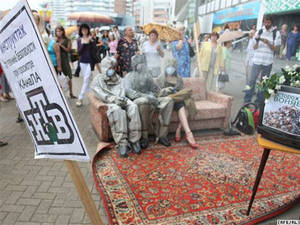 Акция проходила на столичной площади у Комаровского рынка, где активисты Белорусского республиканского союза молодежи провели перформанс "Специально для НТВ!".