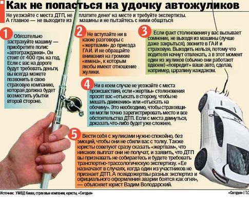 Как говорят юристы, схема «ДТП с дорогим автомобилем» довольно популярна. Но есть еще одна: «сбитый пешеход». «Я, видимо, стала жертвой такой аферы. Выезжала с парковки супермаркета, когда моя машина внезапно сбила пешехода. Все произошло настолько быстро, что я не успела даже ничего понять. Помню только, как какой-то мужчина сползал по лобовому стеклу, оставляя вмятины на капоте. Когда я выскочила, он корчился от боли. Подбежали какие-то люди, которые говорили, что видели, как я сбила пешехода. Советовали «договориться на месте», — рассказывает киевлянка Мария Соловьева. Адвокат Вадим Володарский считает, что делать это ни в коем случае нельзя, а мошенников следует пугать экспертизами.
