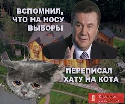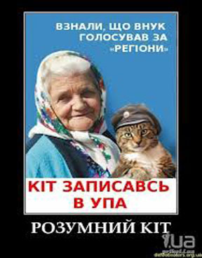 В Восточной Украине появился плакат с изображением бабушки и кошки, высмеивающий Партию регионов Януковича. «Узнала, что внук голосовал за регионалов, переписала хату на кота», - гласит плакат. Фотографии плаката стали хитом в Интернете, - сказано в материале The Wall Street Journal.