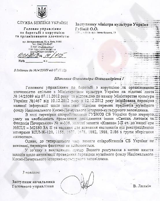 В распоряжение СМИ попало письмо, в котором сотрудники СБУ сообщали руководству Минкульта о том, что так и не получили доступа к фонду заповедника. Служба безопасности от лица заместителя начальника Главного управления Владимира Ляпкина попросила на тот момент заместителя министра культуры Украины Александру Губину «ускорить» доступ к экспонатам. Сотрудники СБУ обратили внимание, в первую очередь, на необходимость проверки исследования иконы «Святых Антония и Феодосия Печерских», золотой монеты «Кавказ» I-II столетия до нашей эры, а также на предоставление для изучения ряда экспонатов из группы «Живопись».