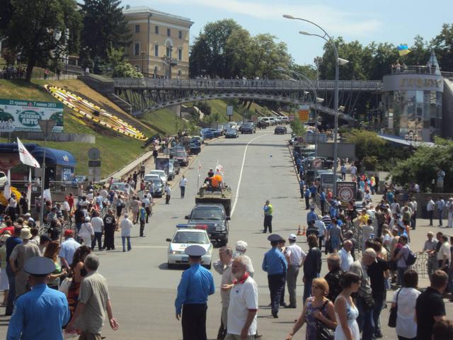 Видите, как отчаянно милиция пытается остановить БРДМ? Даже машину впереди пустили с мигалками, чтобы остановить. А инспектор справа? Несчастный изо всех сил пытается найти спецтехнику, даже вышел на проезжую часть и…. спецтехника спокойно едет дальше…. сквозь оцепление милиции, которое из последних сил »пытались воспрепятствовать»….. Навскидку, по маршруту следования бронеавтомобиля его «пытались» остановить 200-300 омоновцев, рассредоточенных по всем дворам и подворотням от Крещатика до Михайловской площади и ее окрестностях. Но кролики-провокаторы оказались круче Рэмбо и прорвались таки к месту «схватки».