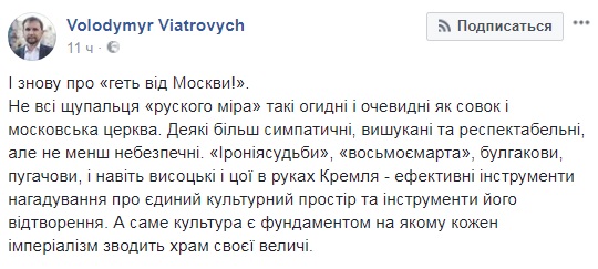 «Не все щупальца «русского мира» так отвратительны и очевидны, как совок и московская церковь. Некоторые более симпатичны, изысканы и респектабельны, но не менее опасны. «Ирониясудьбы», «восьмоемарта», булгаковы, пугачевы и даже высоцкие и цои в руках Кремля – эффективные инструменты напоминания о едином культурном пространстве и инструменты его воспроизводства. А именно культура есть фундаментом, на котором каждый империализм возводит храм своего величия», – провозгласил сегодня Вятрович на своей странице в «Фейсбуке».