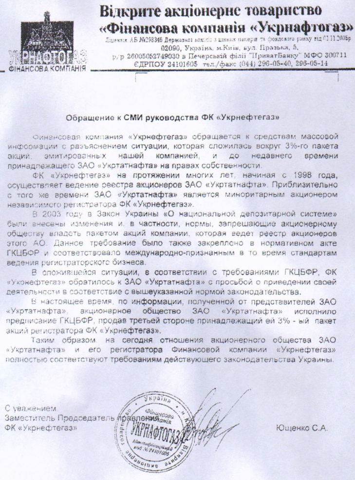 Можно констатировать, что отношения ЗАО «Укртатнафта» и его регистратора ФК «Укрнефтегаз» полностью соответствуют требованиям действующего законодательства Украины.