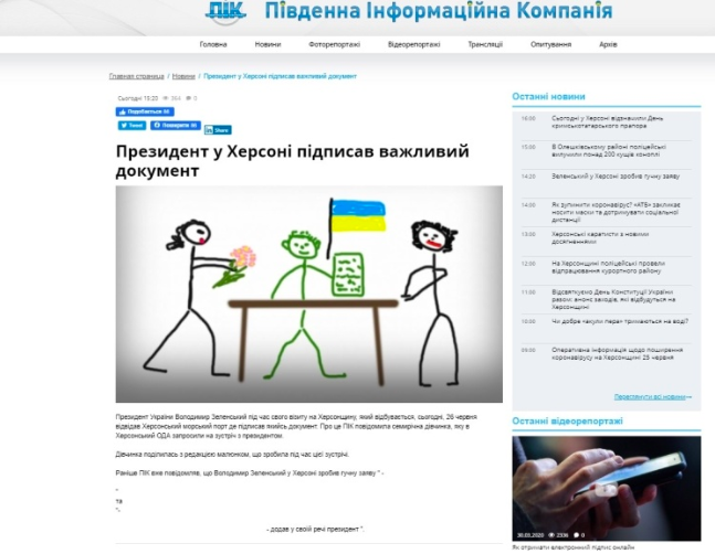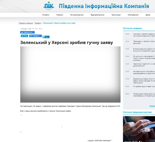 Еще одно издание – «Южная информационная компания» вместо фото Зеленского в Херсоне проиллюстрировало его визит детским рисунком, а вместо его прямой речи – пробелы.