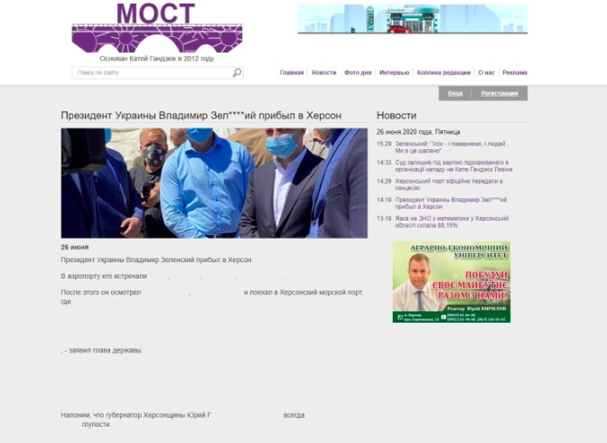 В Херсоне часть местные СМИ не аккредитовали на встречу с президентом Владимиром Зеленским, после этого они объявили акцию протеста и публикуют пустые страницы на своих сайтах с новостями якобы со встречи. Некоторые вместо прямой речи президента оставляют пробелы, а вместо нескольких букв в его фамилии — звездочки.