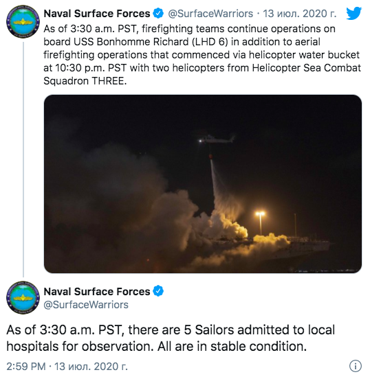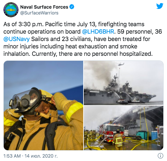 На военно-морской базе в Сан-Диего (штат Калифорния) третий день тушат пожар на десантном корабле USS Bonhomme Richard (LHD 6). Как сообщает Военно-морское командование, количество пострадавших выросло до 57 человек (34 моряка и 23 гражданских), пять человек госпитализированы.