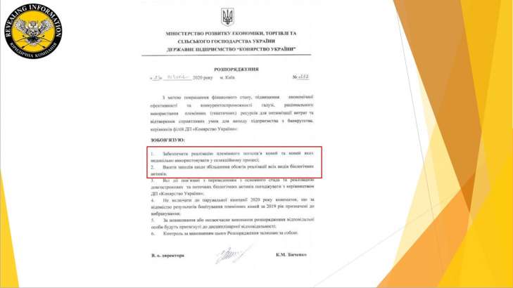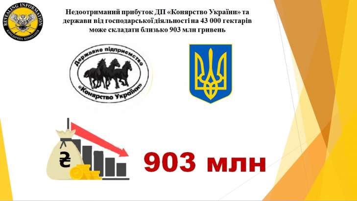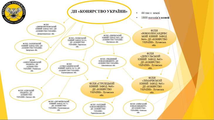 По заявлению адвоката АО "РИ ГРУП" Сабины Кныш, на основании полученных новым руководством госпредприятия документов было установлено, что руководителями конных заводов Луганской области (Стрелецкий, Лимаревский, Деркуливський, Новоалександровский) совершен ряд правонарушений, с использованием государственного имущества, незаконными операциями по посеву, уборке и продаже урожая на землях ГП «Коневодство Украины». Также установлено, что назначенные бывшим исполняющим обязанности госпредприятия ”Коневодство Украины” Зинченко К.М. руководители указанных заводов имеют криминальное прошлое, некоторые ранее были осуждены за тяжкие преступления.