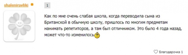 Показательным в этом случае является пример одной семьи, которая, разочаровавшись в British School и убедившись в том, что обещанного образования по британским стандартам ребенок не получит, решила перевести его в государственную ( sic!) школу - «Когда переводила сына из Британской в обычную, пришлось по многим предметам нанимать репетиторов, а там был отличником».