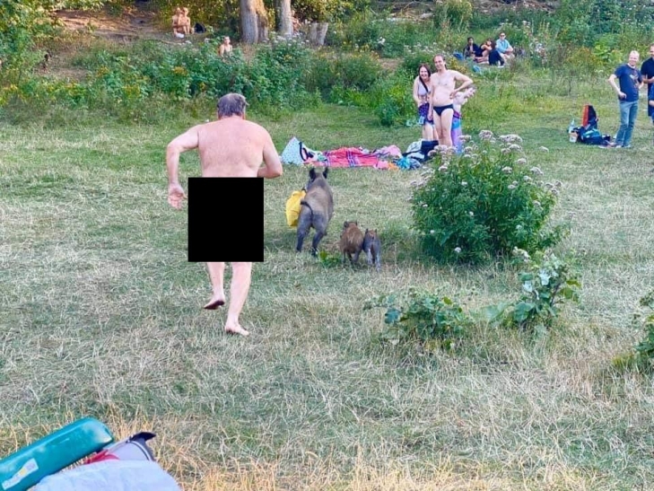 На фото видно трех кабанов, в том числе - двоих детенышей. За ними гонится голый мужчина, у которого они похитили сумку с ноутбуком.