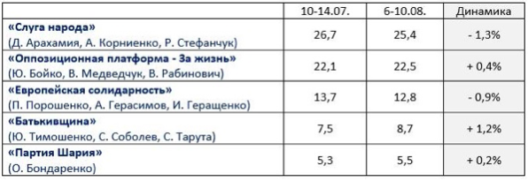 По результатам всеукраинского опроса общественного мнения, который был проведен 6-10 августа 2020 года, если бы парламентские выборы в Украине состоялись в ближайшее воскресенье, то наибольшие шансы на попадание в следующий состав украинского парламента получили бы следующие партии: партия действующего Президента Украины «Слуга народа» (25,4%), «Оппозиционная платформа – За жизнь» Юрия Бойко, Виктора Медведчука и Вадима Рабиновича (22,5%), «Европейская солидарность» Петра Порошенко (12,8%), ВО «Батькивщина» Юлии Тимошенко (8,7%) и «Партия Шария» (5,5%).