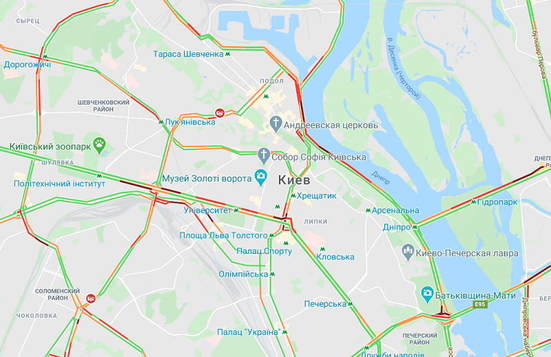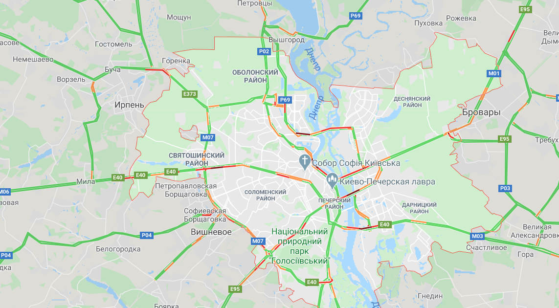 В Киеве утром в понедельник, 17 августа, ситуация на мостах через Днепр складывается следующая: Северный мост движется свободно и без пробок, однако возникла небольшая тянучка в направлении центра, Мост Метро, несмотря на большое количество транспорта, движется без пробок, На мосту Патона пробок нет, однако тянучка возникла перед ним на Левом берегу - остановился проспект Соборности на Березняках, Дарницкий мост едет без пробок, однако довольно плотно, Южный мост тоже движется свободно, однако проспект Бажана перед ним стоит в пробке от "Славутича" до "Осокорков". Об этом свидетельствуют данные Google Maps.