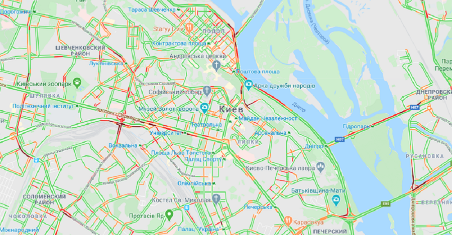 Утром в четверг ситуация на мостах через Днепр складывается следующая: Северный мост движется с тянучками в обоих направлениях, Мост Метро несмотря на большое количество транспорта движется без пробок, только с небольшой тянучкой в направлении центра города, на мосту Патона пробок нет, однако тянучка возникла перед ним на Левом берегу - остановился проспект Соборности на Березняках, Дарницкий мост застрял в пробке в направлении центра, Южный мост - пробки наблюдаются в направлении центра города, а проезд в обратном направлении загружен, возможны тянучки. Проспект Бажана перед мостом стоит в пробке от "Славутича" до "Осокорки". Об этом свидетельствуют данные Google Maps.
