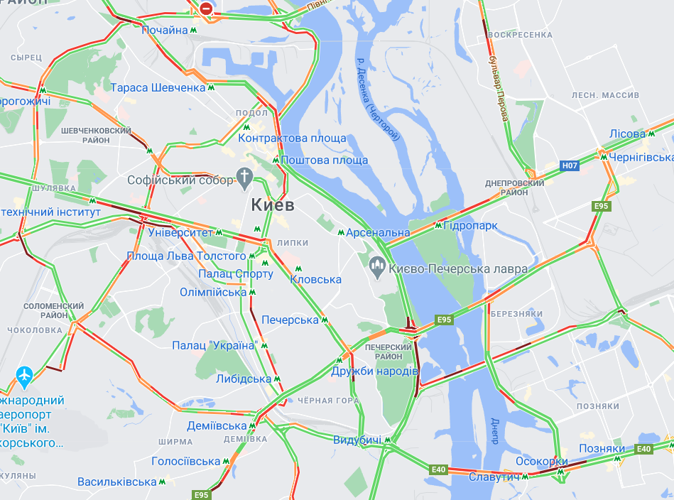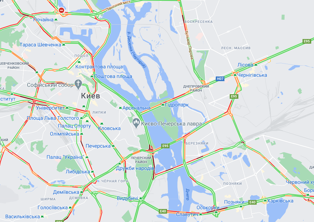 Пробка на съезде на проспект Героев Сталинграда в сторону Оболони, Мост Метро движется с проблемами в сторону центра, в сторону левого берега проезд также немного осложнен, небольшая пробка организовалась на Броварском проспекте, на мосту Патона значительных трудностей, однако, трафик достаточно плотный в сторону центра города, но пробка есть на развязке на правом берегу и тянучка на развязке на левом, на Дарницком мосту движение в центр города очень осложненное, кроме того на подъезе к мосту тянется Дарницкое шоссе. Проехать в обратном направлении можно без проблем, Южный мост традиционно не спешит в направлении центра города.