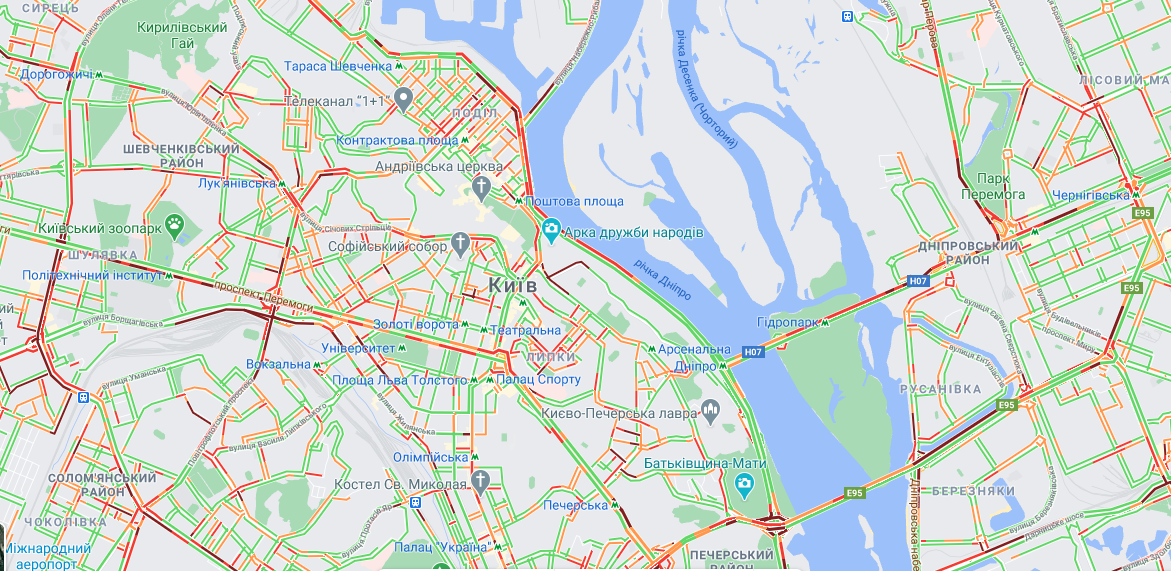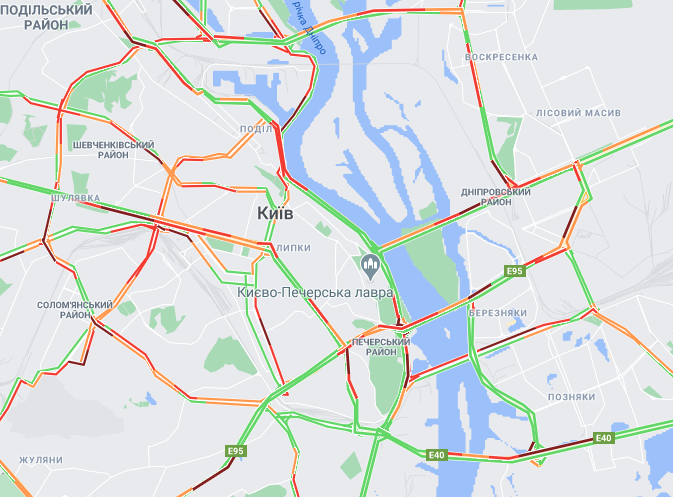 Утром во вторник, 8 сентября, ситуация на мостах через Днепр складывается следующая: Северный мост плотно движется в направлении центра. Тянучка наблюдается на проспекте Шухевича. В направлении левого берега проезд свободный; Мост Метро движется тоже плотно в сторону центра, скопление автомобилей наблюдается на Броварском проспекте и начинается еще при подъезде к метро "Дарница"; на мосту Патона условно свободное движение. Об этом свидетельствуют данные Google Maps.