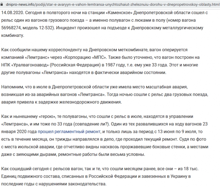 При анализе оперативных сводок «Укртрансбезпеки» оказалось, что именно продление и допуск на железную дорогу подвижного состава с продленными сроками эксплуатации (вопреки принятым нормативам) являются причиной большинства происшествий с грузовыми вагонами на железной дороге. Ежедневно происходит несколько таких небольших ЧП (нагрев букс, поломки тормшзов и т.п.) – и каждое из них грозит перерасти в серьезную аварию.