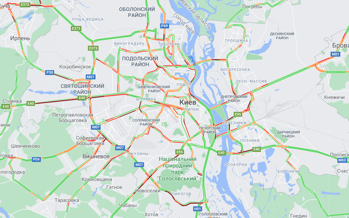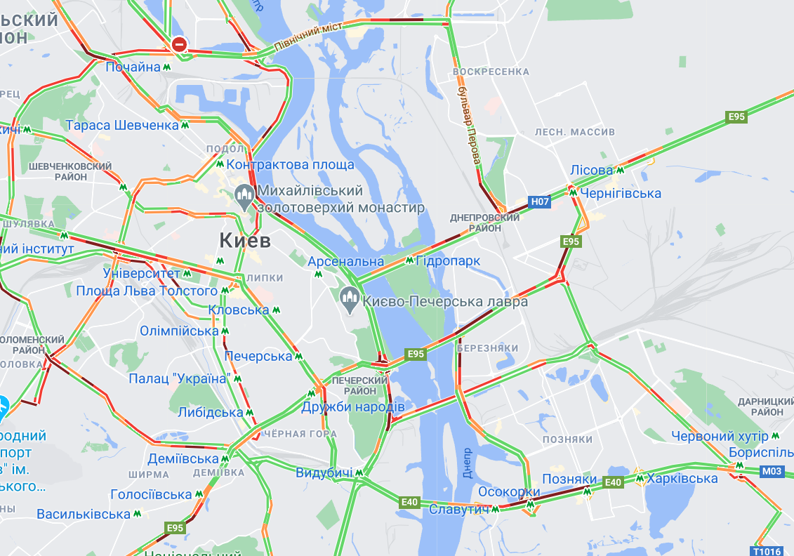 Движение на мостах через Днепр традиционно осложнено: На Северном мосту транспорт движется в направлении правого берега с проблемами. На проспекте Романа Шухевича, перед въездом на мост, возникла пробка. На мосту Метро и Русановском мосту ситуация аналогичная, большая пробка начинается на Броварском проспекте в направлении центра. На мосту Патона движение в направлении правого берега медленное. На развязках с обоих берегов Днепра образовались пробки. На Дарницком мосту образовалась большая пробка. На Южном мосту движение значительно замедлено. Об этом свидетельствуют данные Google Maps.