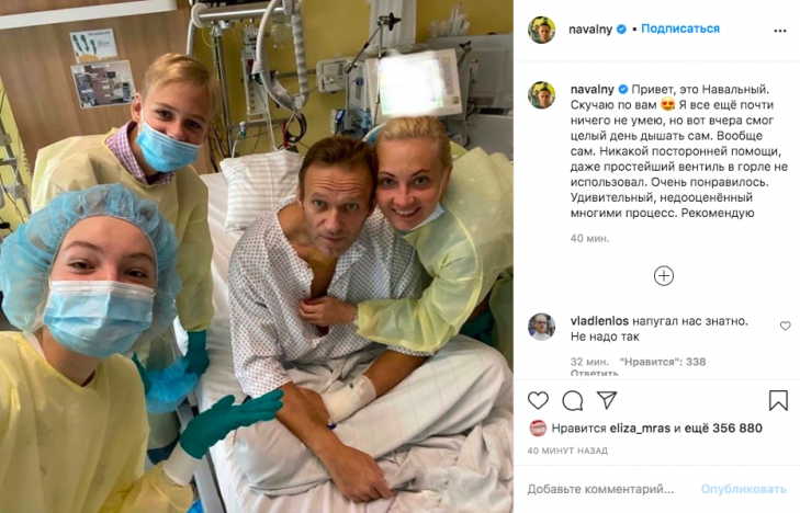 «Привет, это Навальный. Скучаю по вам. Я все еще почти ничего не умею, но вот вчера смог целый день дышать сам. Вообще сам. Никакой посторонней помощи, даже простейший вентиль в горле не использовал. Очень понравилось. Удивительный, недооценённый многими процесс. Рекомендую», — подписал он фото.
