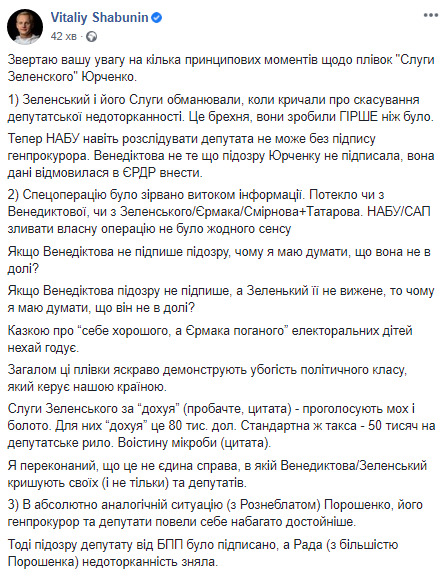 "Слуги Зеленского за "дохуя" (простите, цитата) - проголосуют мох и болото. Для них "дохуя" это 80 тыс. долл. Стандартная же такса - 50 тыс. на депутатское рыло. Поистине микробы (цитата). Я убежден, что это не единственное дело, в котором Венедиктова / Зеленский крышуют своих (и не только) и депутатов", - отмечает Шабунин.