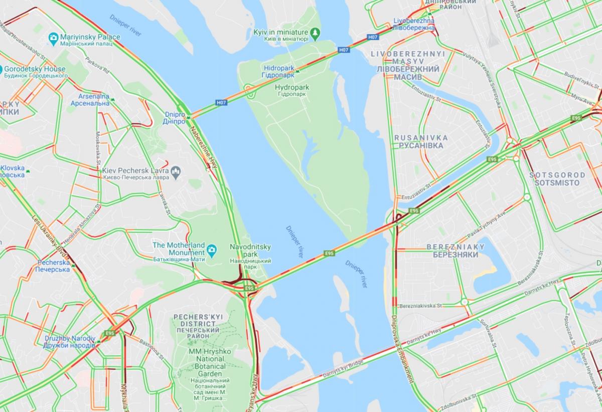 Небольшие тянучки - на проспекте Павла Тичины. Правый берег также страдает от перегрузки дорог. Большая пробка образовалась на Набережном шоссе - от моста Метро и до Подола. Осложнен проезд на Гаванском мосту и улице Набережно-Рыбальской. Большие пробки образовались на улице Богатырской, проспекте Степана Бандеры и улицы Елены Телиги. Значительно затруднено движение по улицам Автозаводской и Семена Скляренко.