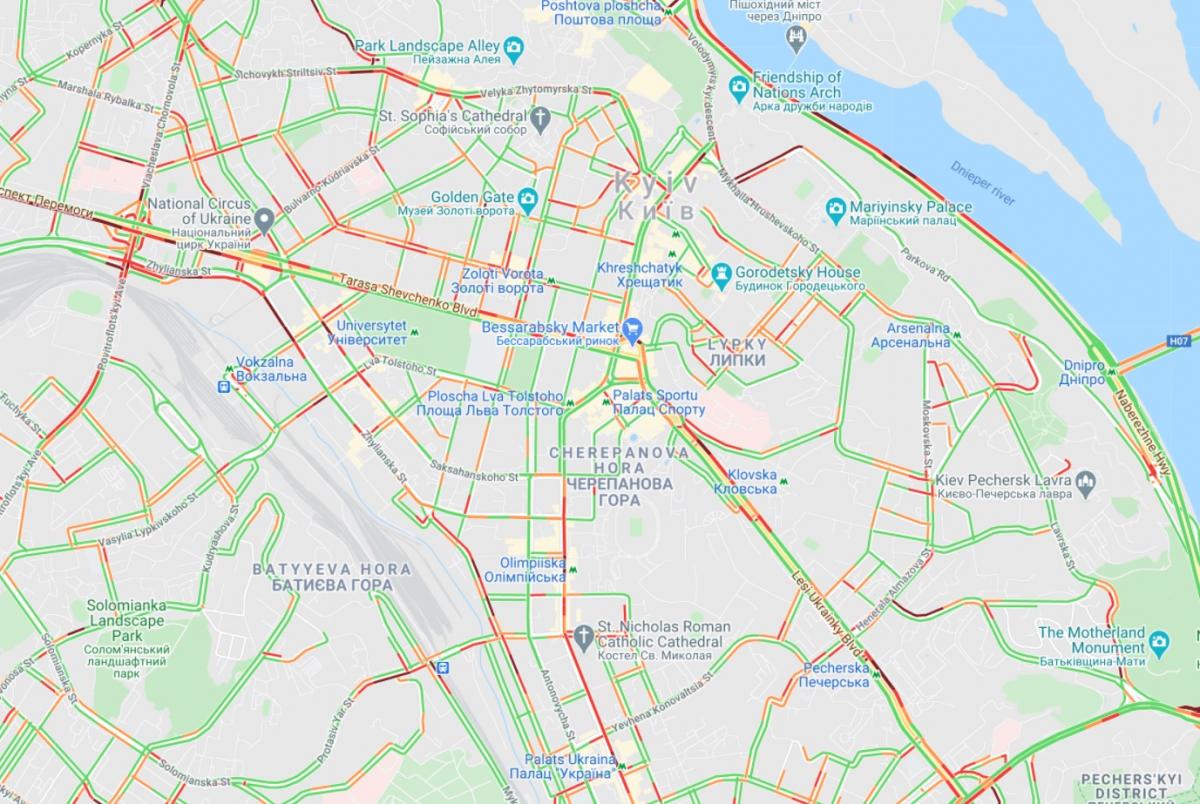 В центре Киева пробки возникли на улице Шелковичной, Лютеранской, Михаила Грушевского, Петровской аллее. Перегружены дороги на Владимирском спуске, улице Костельной и на Крещатике, алее Героев Крут.