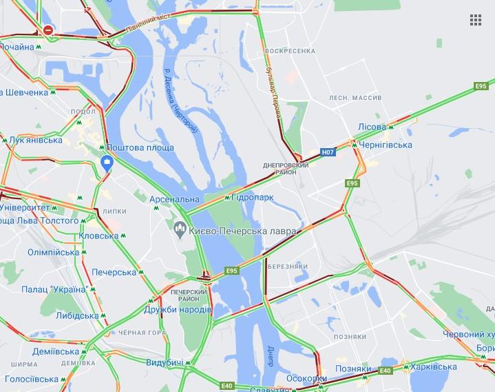 На Северном, мосту Метро, Дарницком и мосту Патона движение затруднено в направлении правого берега, Южным мостом можно проехать свободно.
