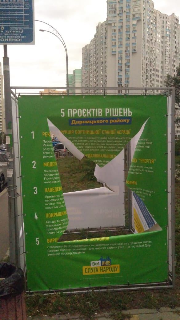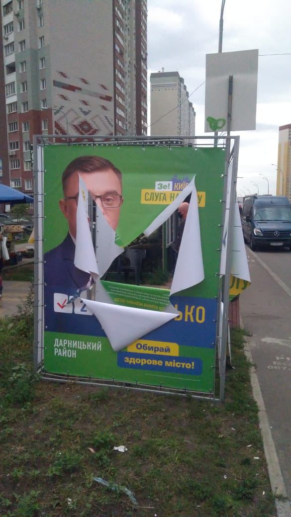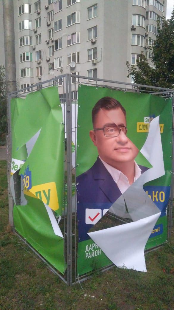 Уже который день в Дарницком районе неизвестные крушат и ломают агитационные палатки кандидата в депутаты Конопелько Николая, который баллотируется в Киевсовет от партии «Слуга народа» по Дарницкому району.