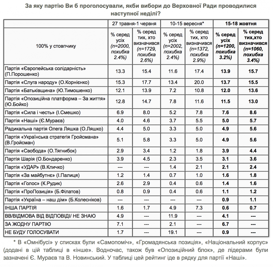 Меньше поддержки имеют "Сила и честь" (7,6% и 8,6%), "Наши" (5% и 5,7%), Радикальная партия Ляшко (4,9% и 5,6%), "Украинская стратегия Гройсмана "(4,9% и 5,6%). Партия "Свобода" 3,9% и 4,4%. В других партий - ниже поддержка.