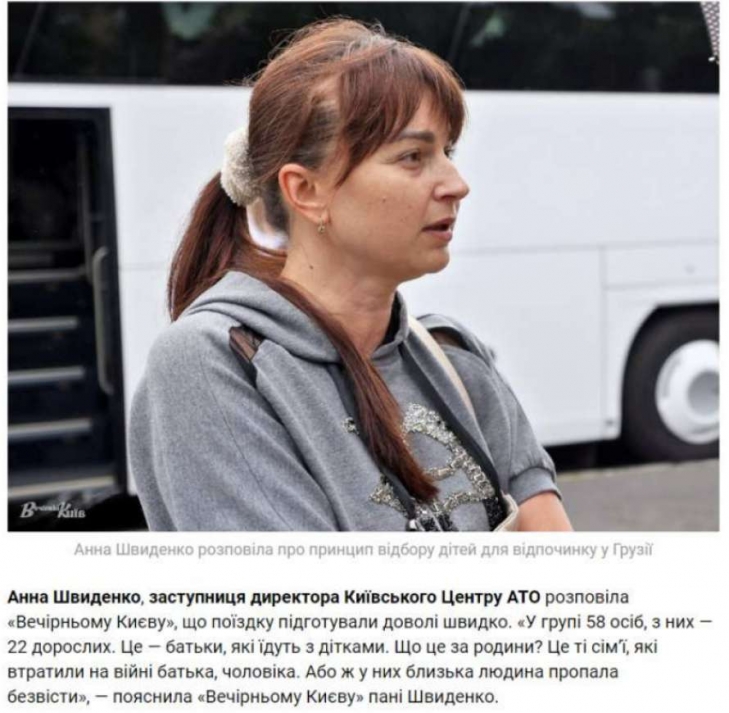 "Трохи шокована, бо не знала, що людина на фото Ганна Швиденко - це директор центру допомоги сім'ям загиблих, бо нам вона представилася як супроводжуюча. У липні ми їздили з дітьми до Грузії. Поїздку для сімей загиблих організовувала Грузія та КМДА, тому що нас проводжали посол Грузії та радник Кличка Марина Хонда, від початку з поїздкою щось не залагодилося, бо в поїздку я записувалася разом зі своєю знайомою, яка теж втратила на війні чоловіка і залишилася з двома дітьми. Поїздку нам спочатку підтвердили, але за два дні їй передзвонили і сказали, що дуже багато людей, і її з дітьми переносять на наступний заїзд. Я з дитям поїхала, а вона ні.