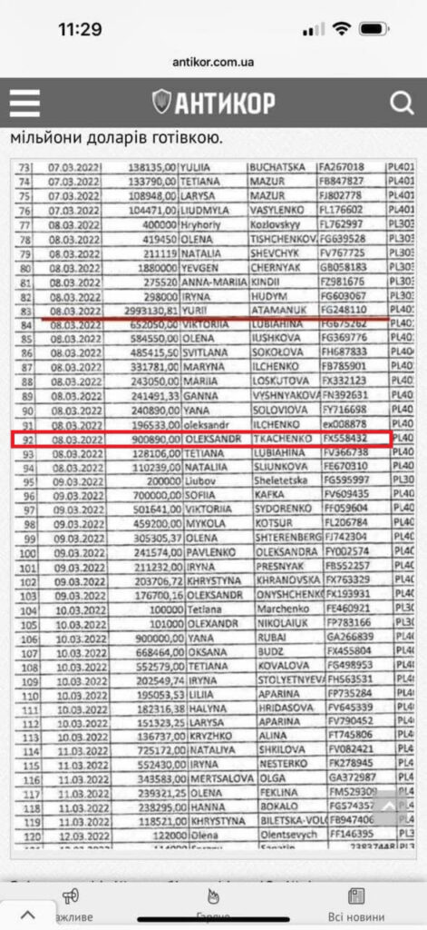 У додатку до листа НАБУ міститься список осіб, які ввезли в Польщу валюту. Детективи НАБУ чітко зафіксували перелік українців які з перших днів вторгнення до вересня 2022 вивозили готівку в розмірі понад 100 тисяч євро. Цікаво, що дані особи не декларували гроші «на вивіз», а лише заявляли про це митниці суміжних країн. Перелік достатньо великий, адже в опублікованій сторінці фігурують номери від 73 до 120. Лише за 4 дні, з 7 до 11 березня 2022, без декларування було вивезено майже 19 млн. доларів. Загальна сума може сягати кількох мільярдів.