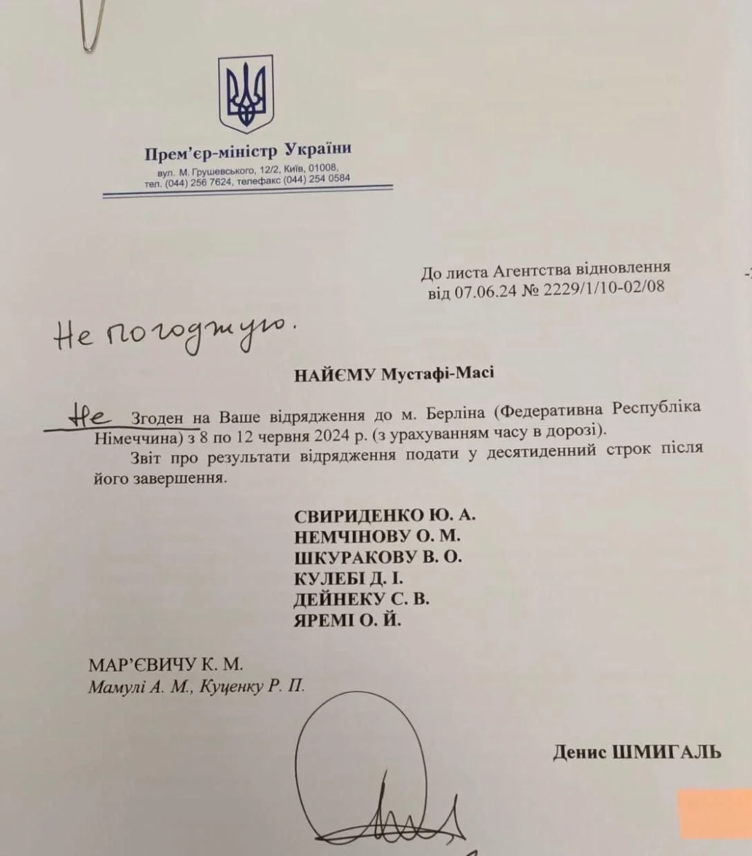 У розпорядженні редакції NV Бізнес опинилася фотокопія розпорядження про відмову Найєму у відрядженні до Берліна, підписаного Шмигалем.