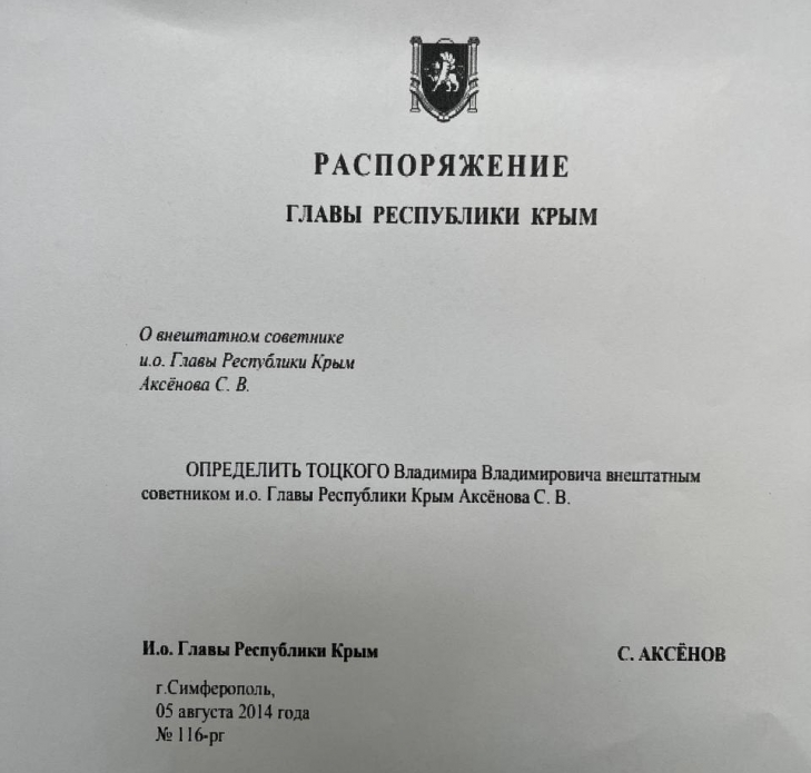Отже, робота батька на росіян не завадила Сергію Тоцькому і після 2014 року продовжити спокійно працювати в органах СБУ, щасливо оминувши всі перевірки та люстраційні заходи. А після отримання паспорта РФ, Тоцький в якості офіцера запасу СБУ та керівника безпекового підрозділу найбільшої енергетичної компанії України багато разів відвідував анексований Крим, не маючи при цьому ніяких проблем з російськими спецслужбами.
