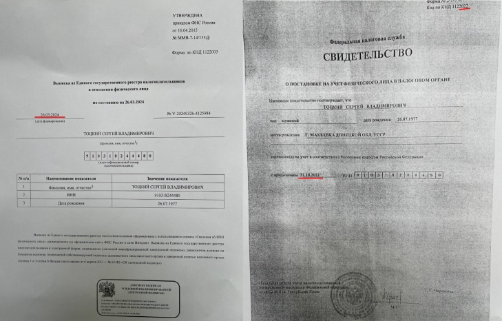 Та тепер давайте згадаємо, кого саме захищає Ніколов. Сергій Тоцький – громадянин РФ, що добровільно отримав паспорт країни-агресора у 2015 році в окупованому Криму. Після початку повномасштабного вторгнення російських військ, Сергій Тоцький, незважаючи на воєнний стан, знову виїхав через Молдову до окупованого Криму. Там, 31 жовтня 2022 року, він отримав свідоцтво російської федеральної податкової служби про постановку на облік як фізичної особи в податковому органі.