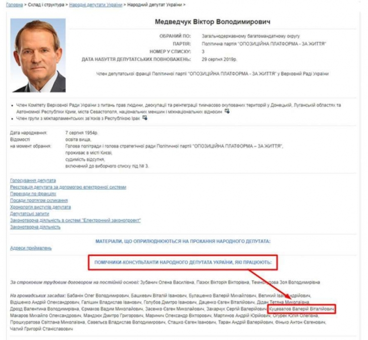2019–2022 — офіційно значився як помічник народного депутата Віктора Медведчука, одного з ключових проросійських політиків України.