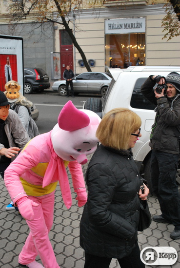 Ударить юмором по эпидемии решили студенты Политехнического института. Сначала они ездили в метро в карнавальных масках, а потом вывели на Майдан Незалежности человека в костюме розовой свиньи. Хрюшка вела себя активно — прохожие с удивлением наблюдали за тем, как она пожимала руки народу в масках, присаживалась на капот автомобиля, звонила из автомата...