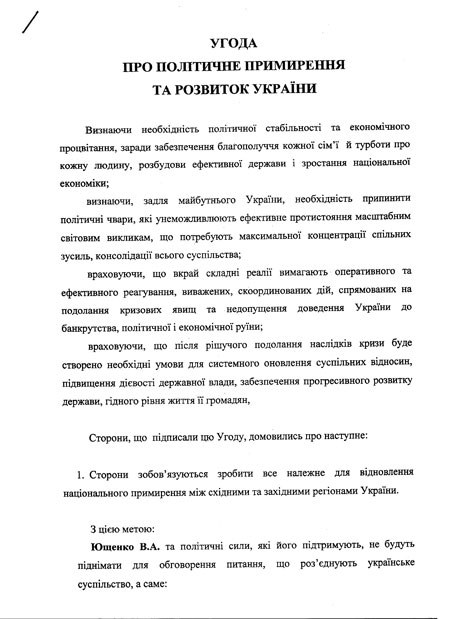 Экс-руководитель главной службы по внутриполитическим вопросам и региональному развитию Секретариата президента Украины Козачок Я. В. обнародовал соглашение о взаимодействии Виктора Ющенко и Виктора Януковича, скрепленное их подписями.