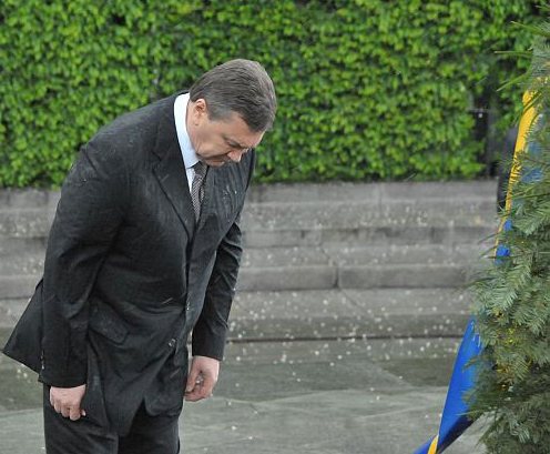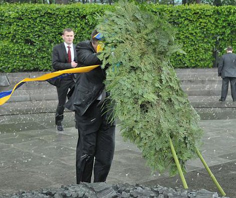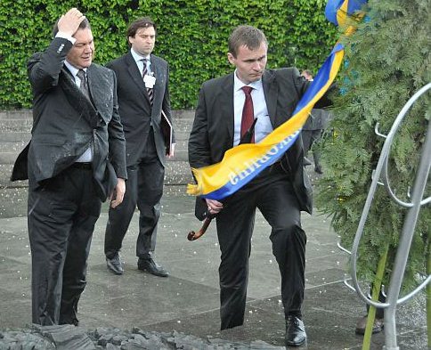 Во время церемонии начался сильный ливень с ветром и градом. В это время Янукович и Медведев как раз шли к памятнику. Когда Янукович положил свой венок, он вдруг оторвался и полетел на него.