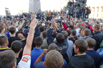 После этого группа молодежи - несколько сотен человек, среди которых были нетрезвые, - двинулась с площади по улице Ленина. Произошло это после того, как один из молодых людей сообщил о том, что его "избили кавказцы". Участники акции перекрыли движение по улице Ленина, возникли мелкие потасовки.