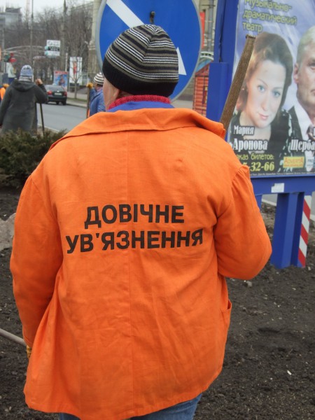 В Донецке работники местного «Зеленстроя» носят странную форму. На улице Артема замечены работники в спецодежде с надписью «Пожизненно осужденный», передает «Газета по-киевски».
