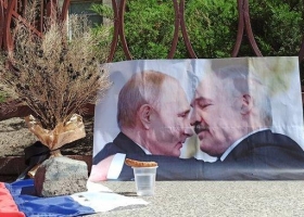 Под посольством Беларуси в Киеве сожгли портрет Лукашенко с Путиным