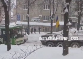 В Ривне БТРу пришлось вытаскивать из снега троллейбус: видео показали в сети