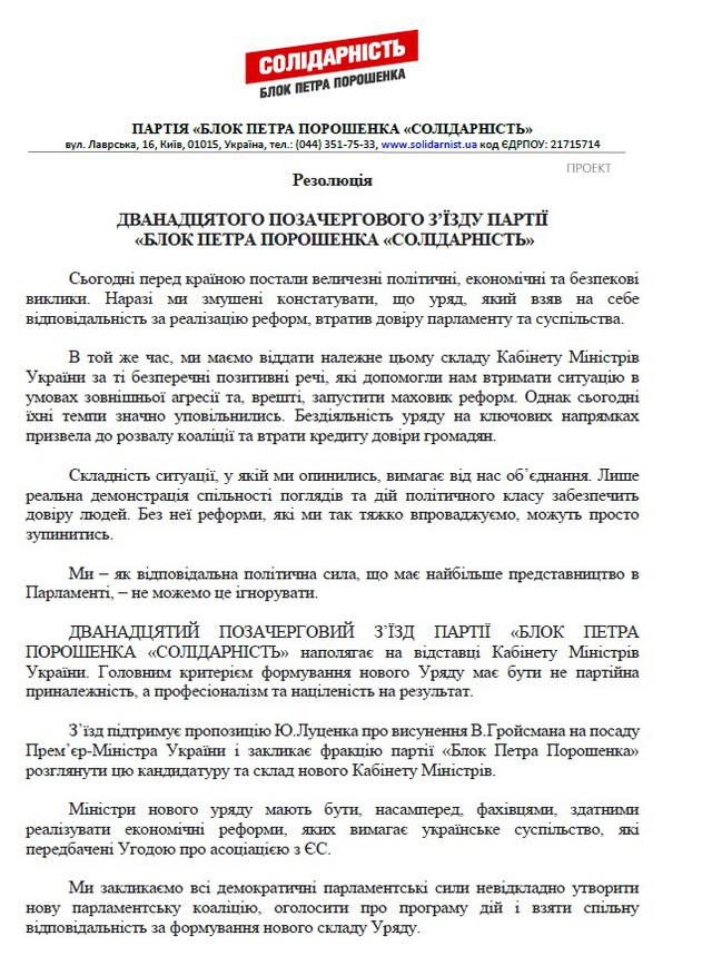 Внеочередной съезд партии «Блок Петра Порошенко - Солидарность» принял резолюцию, в которой призывает к отставке Кабинета министров и выдвижении кандидатуры Владимира Гройсмана на должность премьер-министра...