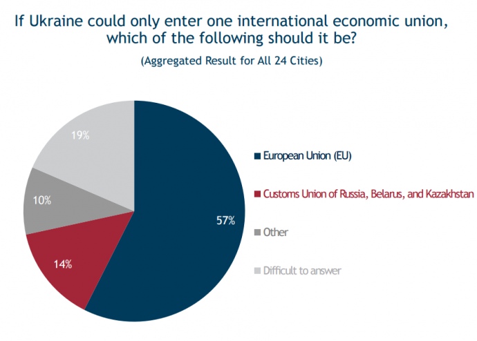 Вступление в ЕС поддерживают 57% украинцев, еще 14% хотят присоединиться к Таможенному союзу с Россией, Казахстаном и Беларусью. 10% считают, что Украина должна вступить в другой союз, 19% затруднились ответить.