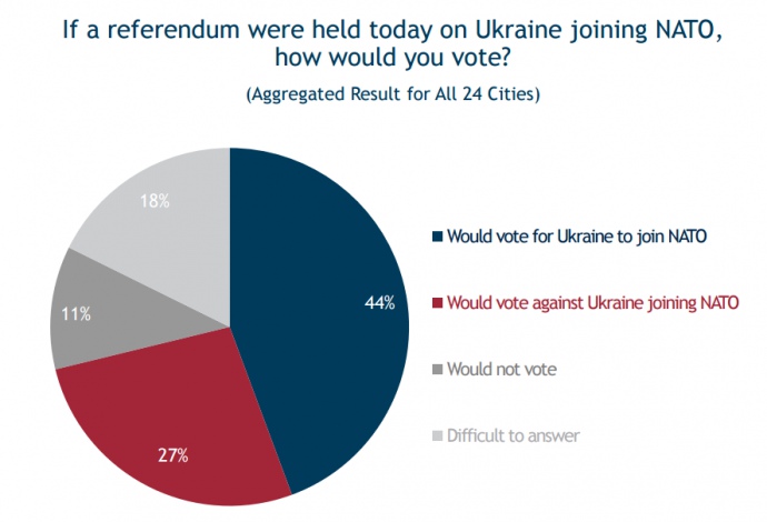 Если бы референдум о вступлении в НАТО состоялся сегодня, такое вступление поддержали бы 44% украинцев. Против проголосовали только 27%, еще 11% не голосовали бы вообще. 18% опрошенных затруднились ответить.