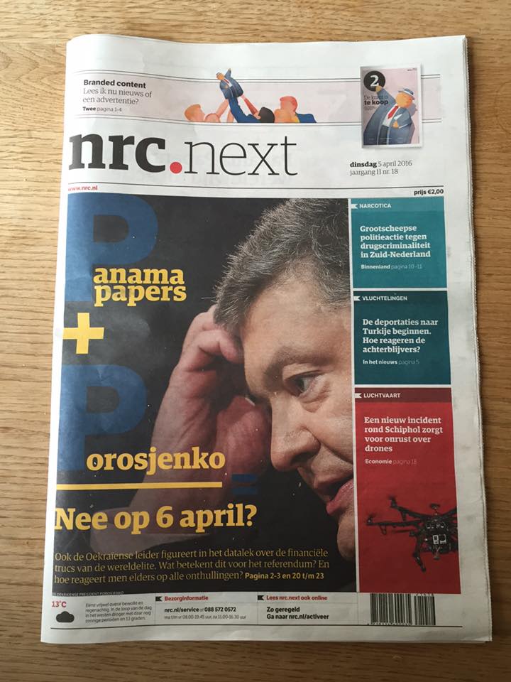 «Обложка самой умной газеты Нидерландов сегодня под заголовком : «Панамские документы + Порошенко = нет на референдуме?» Завтра узнаем», — написала Залищук.