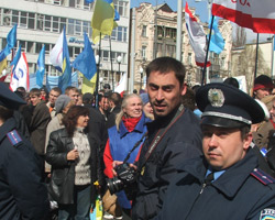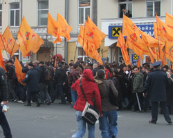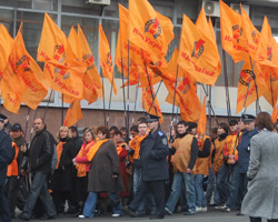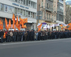 Обе группы разделял милицейский кордон и металлические ограждения. После завершения брифинга г-на Кириленко, «оранжевая» колона отправилась в сторону Дворца спорта.