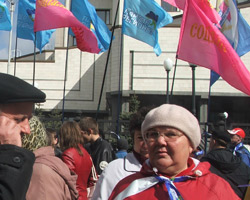 При входе на территорию Суда «оранжевая» колона встретила 250 сторонников Коалиции. «Бело-голубые» держали в руках флаги Партии регионов Украины, Союза молодежи регионов Украины, Партии «Союз» и Социалистической партии Украины. Собравшиеся скандировали «Против Рады только гады» и выкрикивали нецензурные обращения в адрес «нашеукраинцев».